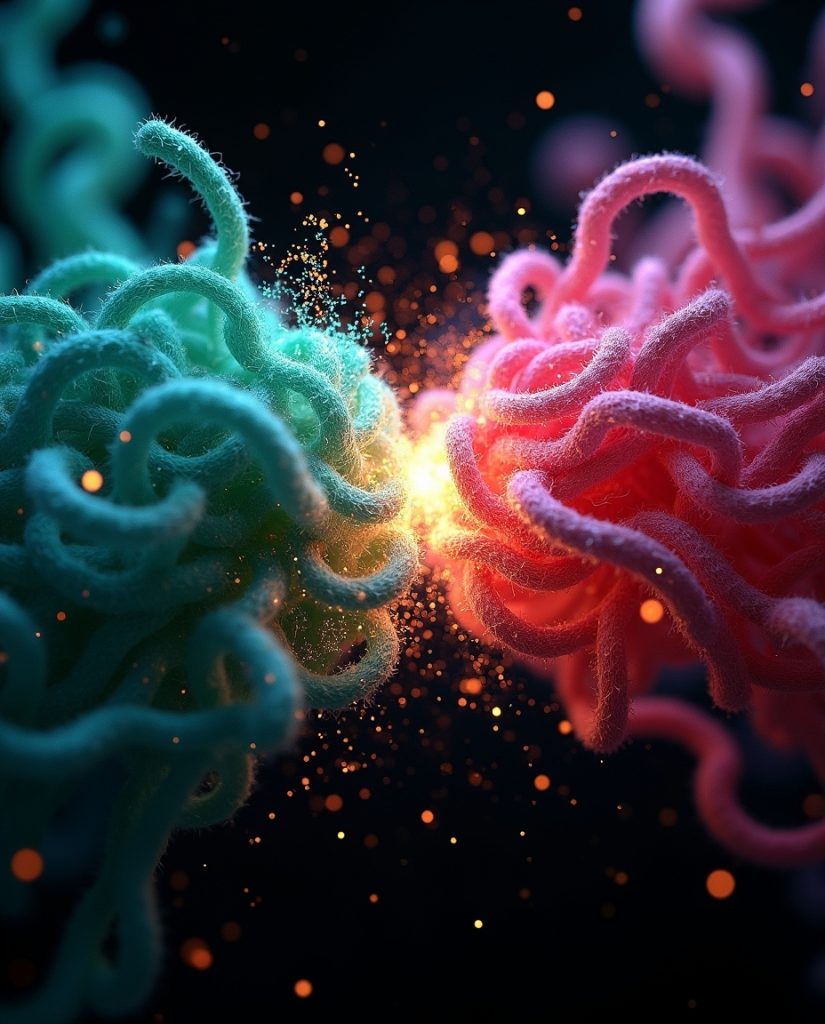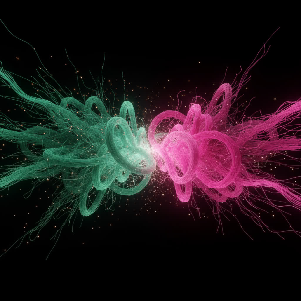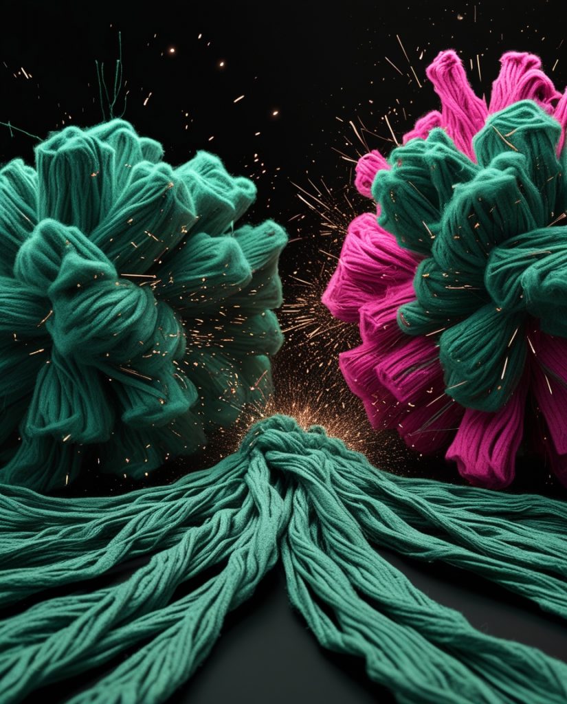 Surreal editorial-style artwork on deep black, with two dense clusters of glowing textile-like fibers exploding toward each other in petrol green and magenta, colliding into luminous woven ribbons.